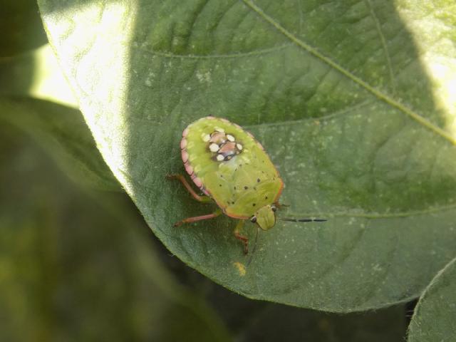 1. Zelene povrtne stenice (Nezara viridula) koja prezimljava kao imago. Sa naličja lista polaže jaja u grupicama. Odrasli insekti se hrane sisanjem biljnih sokova raznih biljnih vrsta i prilikom uboda na mestima na plodu dolazi do diskoloracije i promene boje. Takođe, prilikom napada pomenute štetočine plodovi dobijaju gorak ukus i gube tržišnu vrednost. Kod soje usled napada može izostati formiranje mahuna kada su napadnuti cvetni pupoljci ili izostaje formiranje zrna pri napadu mahuna u ranijoj fazi razvoja. Prisustvo zelene povrtne stenice u usevu parcele registrovano je po rubnim delovima parcela i u ovom momentu hemijske mere suzbijanja se ne preporučuju.